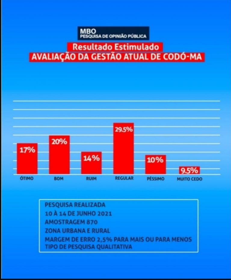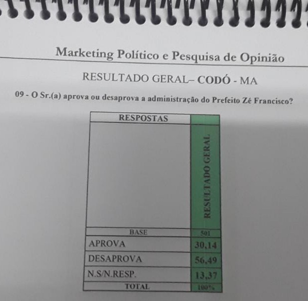 A empresa intitulada BRASIL MARKETING & OPINIÃO, de Marketing Político e Pesquisa de Opinião, realizou entre os dias 31 de julho a 02 de agosto de 2021 pesquisa de opinião sobre política, audiência dos meios de comunicação de Codó e sobre o que acham os codoenses dos primeiros 7 meses de governo do médico Dr. Zé Francisco.