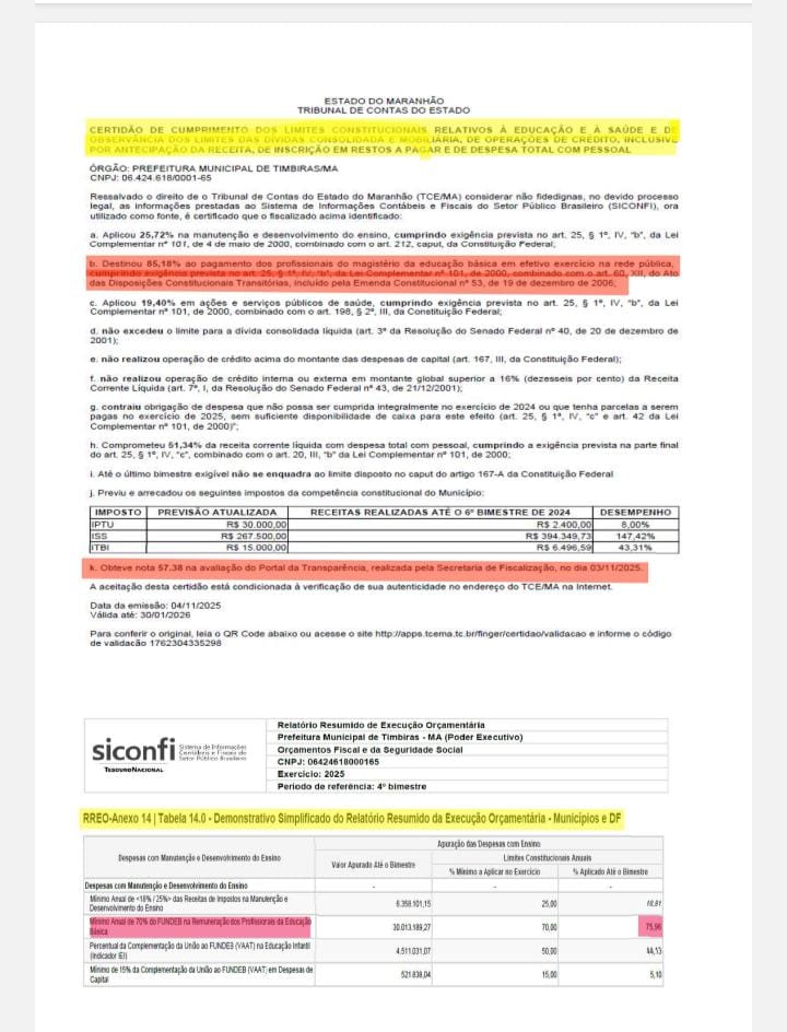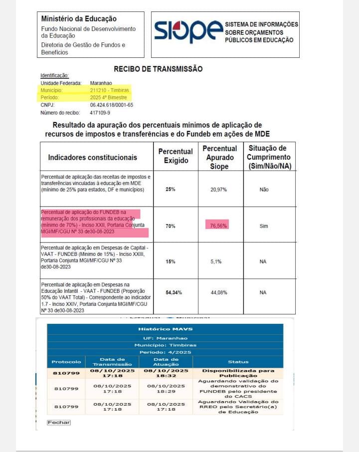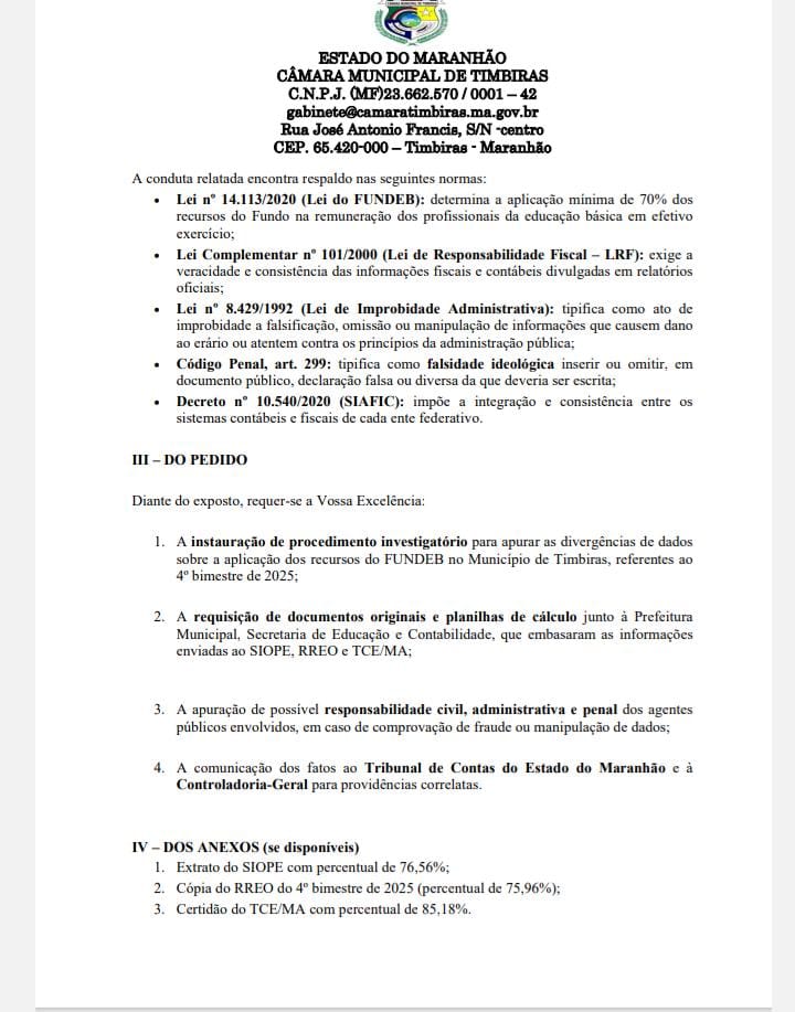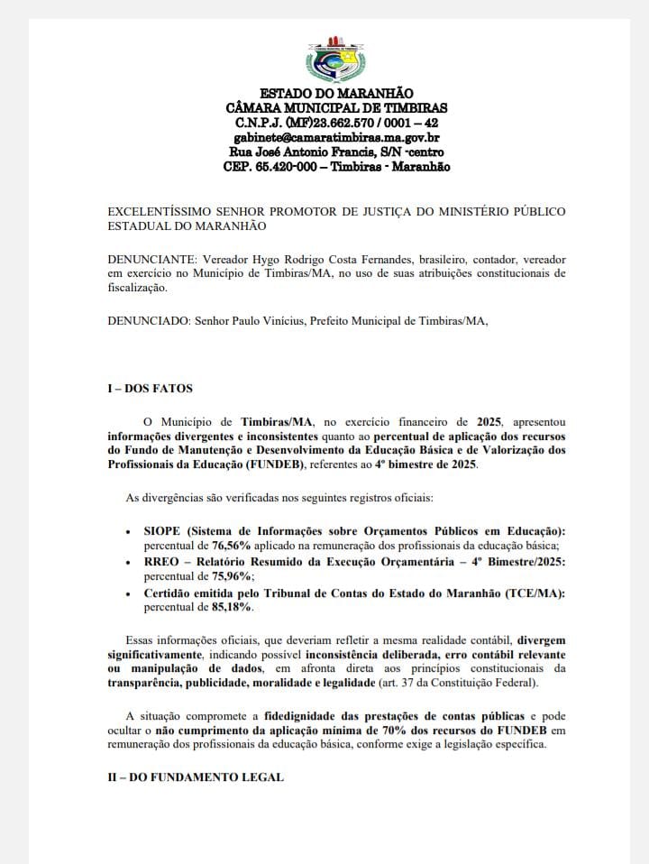 Diante das informações divergentes e inconsistentes quanto ao percentual de aplicação dos recursos do Fundo de Manutenção e Desenvolvimento da Educação Básica de Valorização Profissionais da Educação (FUNDEB), referente ao 4° bimestre de 2025, o Vereador Hygo Rodrigo Costa Fernandes (Hygo Contador), no uso de suas atribuições constitucionais de fiscalização abriu uma denúncia junto ao Ministério Público do Estado do Maranhão