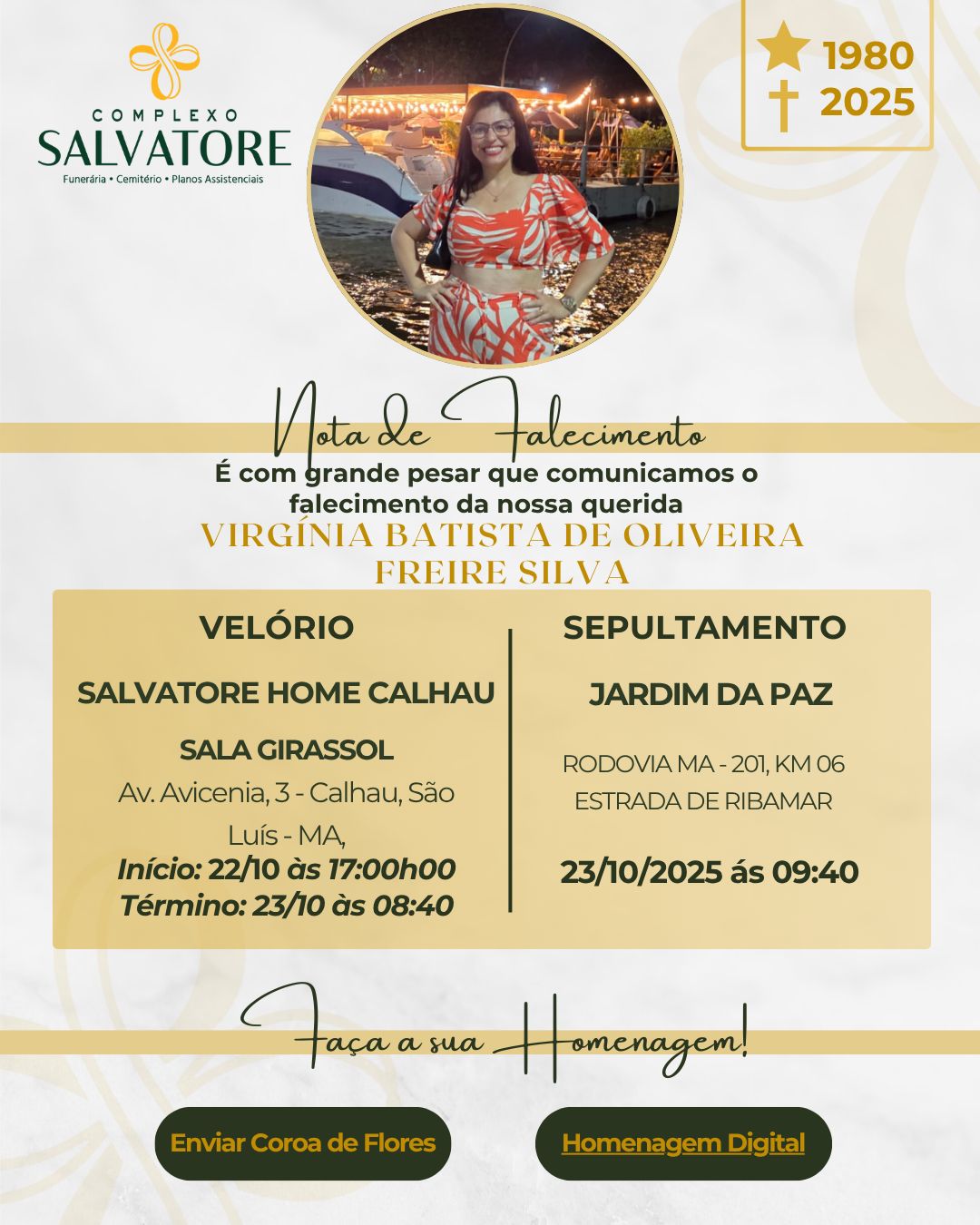 Faleceu na manhã de hoje (quarta-feira, 22/10), a Sra. VIRGÍNIA BATISTA DE OLIVEIRA FREIRE SILVA, aos 45 anos, em São Luís, sobrinha do Vereador Professor Manoel