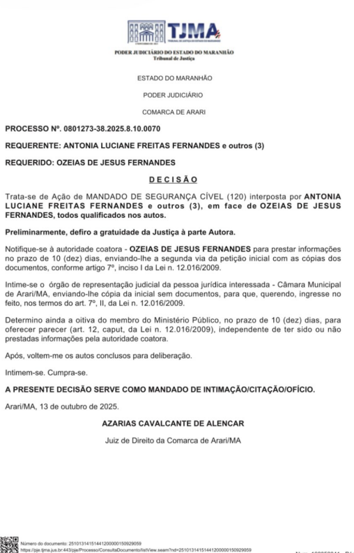 O juiz Azarias Cavalcante de Alencar, da Comarca de Arari, determinou prazo de 10 dias para que o presidente da Câmara Municipal, Ozéias de Jesus Fernandes, se manifeste sobre a decisão que impediu a instalação da CPI do Fundeb, comissão destinada a investigar a aplicação dos recursos do Fundo de Manutenção e Desenvolvimento da Educação Básica referentes a 2025.