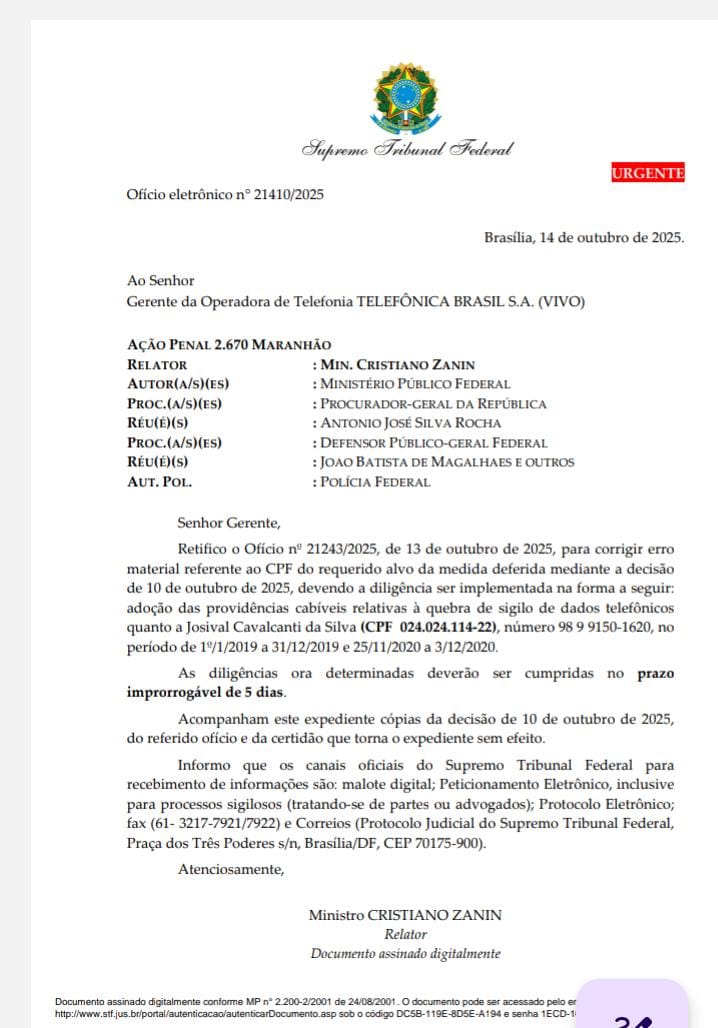 O ministro Cristiano Zanin, do Supremo Tribunal Federal (STF), determinou a quebra de sigilo telefônico de Josival Cavalcanti da Silva, o “Pacovan”, assassinado em junho de 2024. A medida integra a Ação Penal nº 2.670, que apura denúncias de corrupção passiva e organização criminosa envolvendo os deputados federais Josimar de Maranhãozinho e Pastor Gil, além do suplente Bosco Costa (SE), todos do PL.