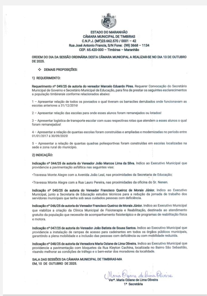 Nesta segunda-feira, dia 13 de outubro, a Câmara Municipal realizará mais uma Sessão Ordinária de 2025. Confira acima o que será discutido e votado na “Ordem do Dia”.