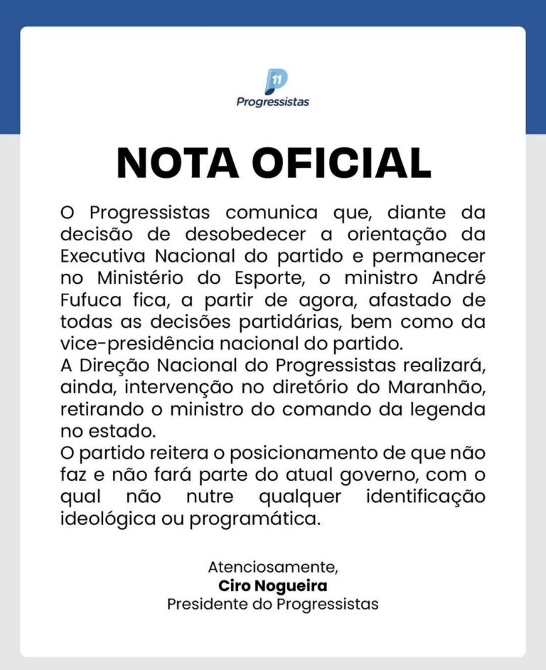 Diante da decisão do ministro dos esportes, André Fufuca, de permanecer no ministério mesmo após o ultimato do partido para que seus filiados abandonem o governo Lula, o presidente nacional da legenda, Ciro Nogueira, afastou o maranhense do comando do partido no estado e da vice-presidência nacional.
