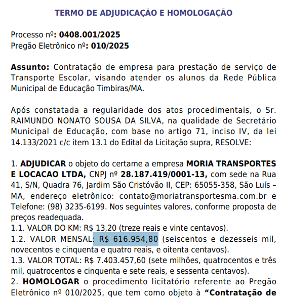 O município de Timbiras, comandado pelo prefeito Paulo Vinicius, firmou recentemente um contrato de transporte escolar com a empresa Moria Transportes e Locação Ltda., no valor de R$ 7,4 milhões para 12 meses. O acordo prevê um custo mensal de R$ 616.954,80 e estabelece o valor do quilômetro rodado em R$ 13,20, números que chamam atenção pelo alto impacto financeiro sobre os cofres municipais.
