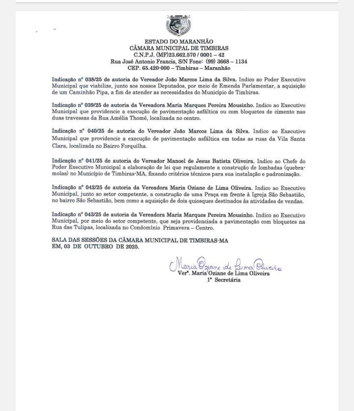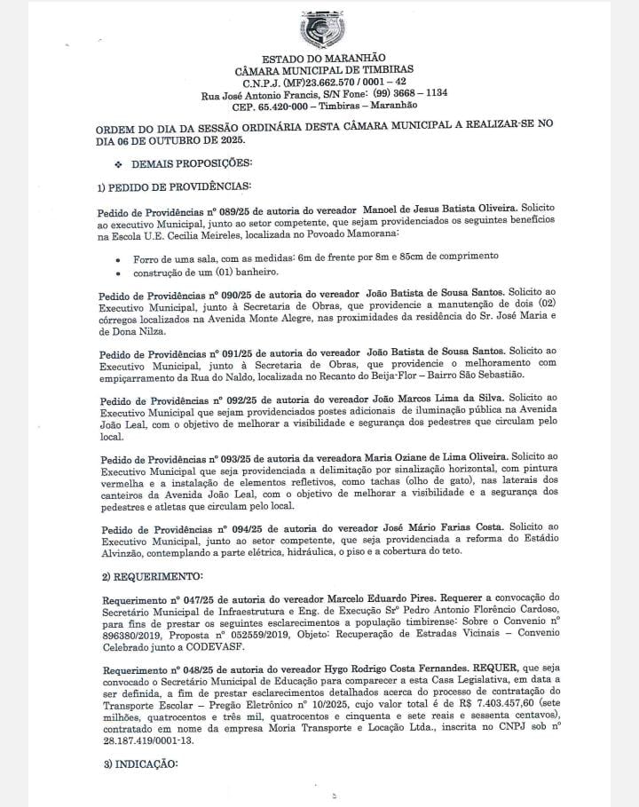 Na Sessão Ordinária, que será realizada nesta segunda-feira, 6/10, na Câmara Municipal de Timbiras, estão na pauta pedidos de providências, indicações e requerimentos de interesse da comunidade, e incluiu também vários outros assuntos.