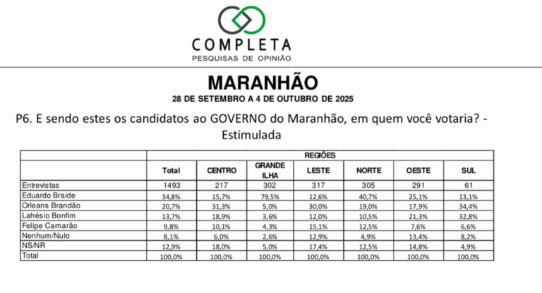 Levantamento do instituto Completa mostra a liderança do prefeito de São Luís, Eduardo Braide (PSD), pela lidera a corrida ao Governo do Maranhão. O secretário de assuntos municipalistas Orleans Brandão é o segundo colocado. A pesquisa foi feita entre os dias 28 de setembro e 4 de outubro de 2025.