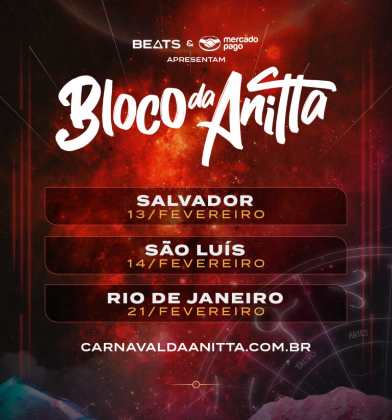 A produção da cantora Anitta anunciou a presença da cantora como grande atração do Carnaval de São Luís 2026. A artista carioca, que comanda o tradicional “Bloco da Anitta” em diversas cidades do Brasil, se apresentará no dia 14 de fevereiro, no corredor da folia Vem pro Mar, montado na Avenida Litorânea.