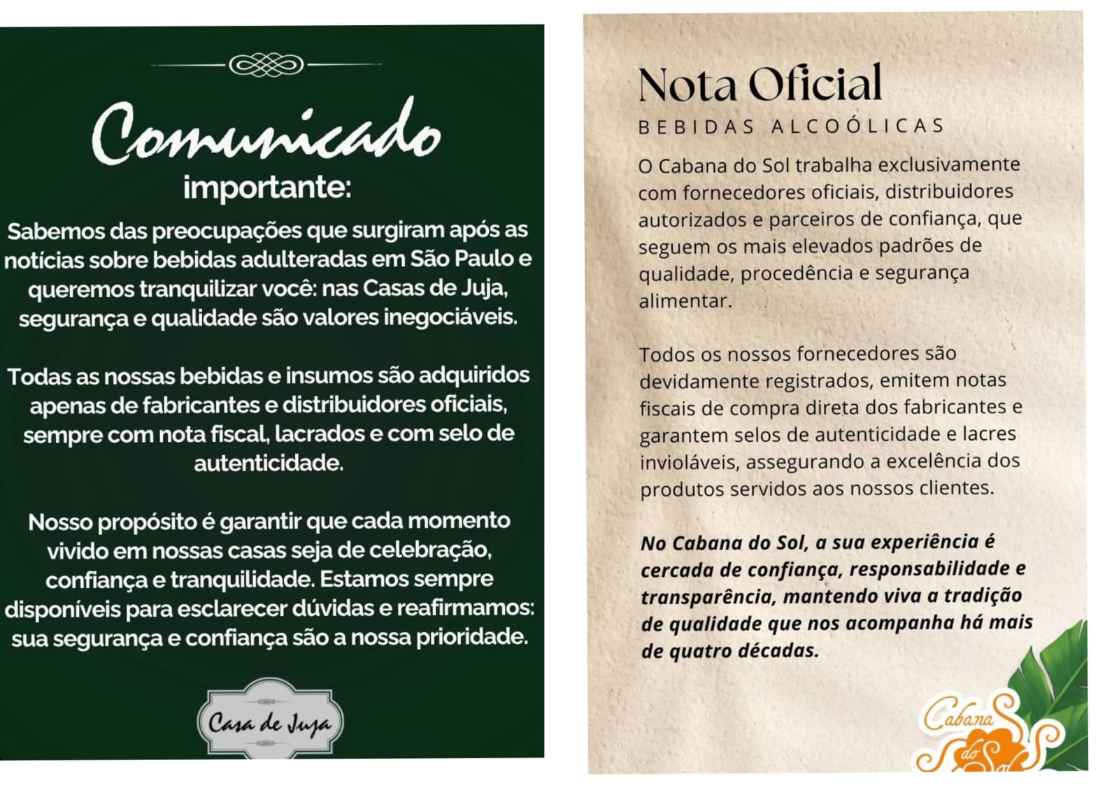 Grandes restaurantes da capital, como Cabana do Sol e Casa de Juja, já emitiram nota de esclarecimento para avisar os consumidores que suas bebidas são lacradas, de boa procedência, com nota fiscais e fornecedores confiáveis.