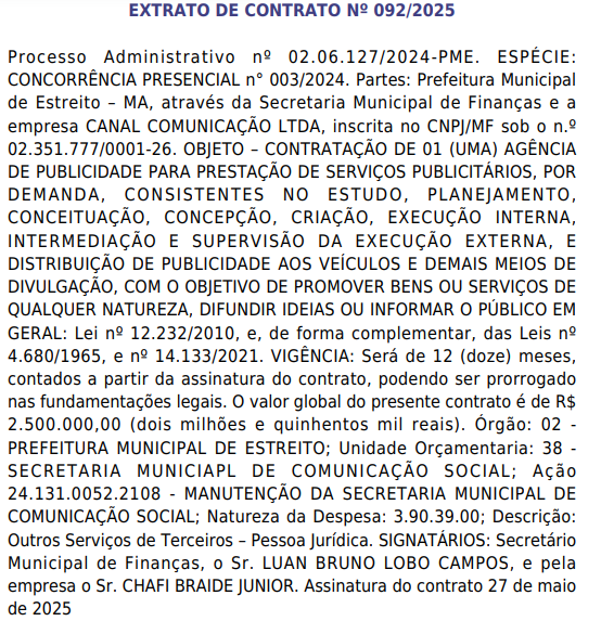 A Prefeitura Municipal de Estreito firmou contrato com a empresa Canal Comunicação Ltda para prestação de serviços publicitários. A contratação, realizada por meio da Concorrência Presencial nº 003/2024, prevê atuação da agência em todas as etapas de comunicação: do planejamento e criação de campanhas à supervisão da execução e distribuição de materiais em veículos de mídia, para divulgar bens, serviços e informações de interesse do município.