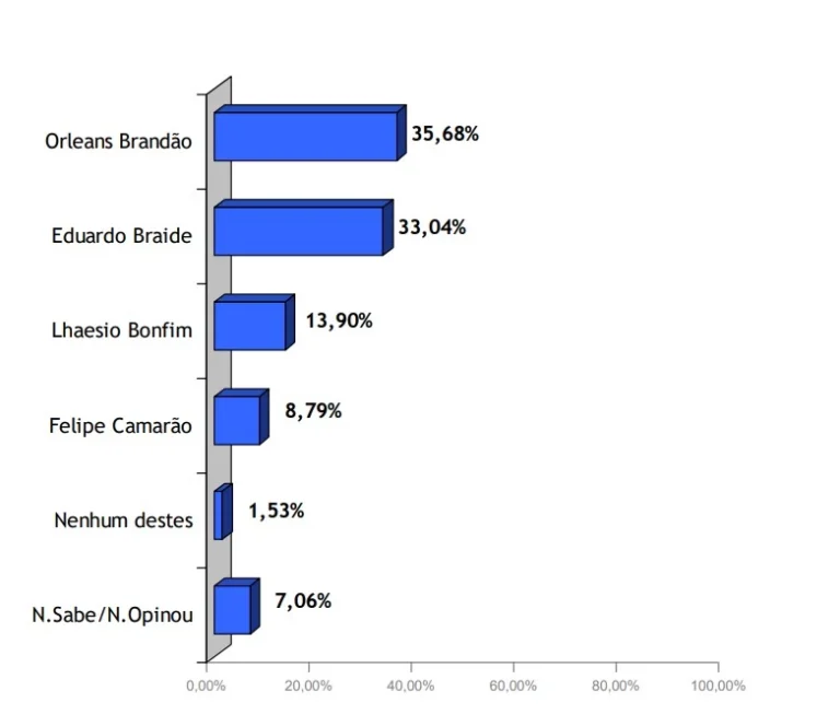 No cenário estimulado, se as eleições fossem hoje, o secretário de governo, Orleans Brandão teria 35,68% dos votos. Depois vem o prefeito Eduardo Braide com 33,04%. Lahesio Bonfim (Novo), ex-prefeito de São Pedro dos Crentes, chega com 13,9% e o vice-governado do Maranhão, Felipe Camarão (PT), com 8,79%.