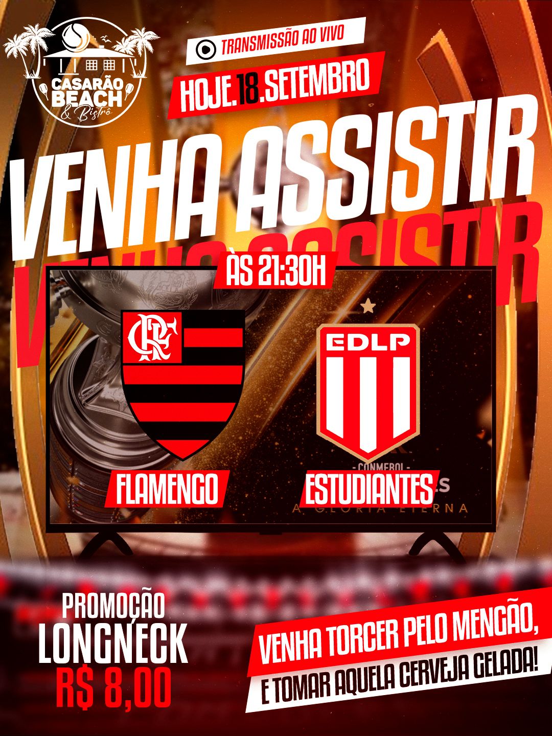 É HOJE! Flamengo e Estudiantes pela libertadores será transmitido ao vivo no Casarão Beach! Junte-se a nós e vibre com cada lance dessa partida emocionante. Não perca essa oportunidade única de acompanhar o clássico da América em um ambiente descontraído e com muita animação. Venha torcer pelo seu time do coração conosco. Te esperamos no Casarão Beach! ⚽️