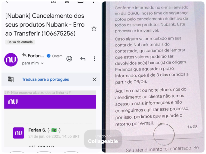 “Recebi com surpresa o e-mail da Nubank informando o cancelamento da minha conta. Quando entrei em contato, informaram que teria que esperar um prazo para a transferência do dinheiro, mas já se passaram 18 dias e até agora nada. Consigo entrar na conta, porém não posso movimentar o dinheiro que está lá”, disse.