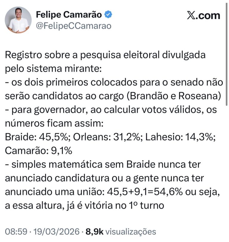 O ponto que mais chamou atenção, no entanto, foi a interpretação política feita pelo vice-governador. Em sua postagem, Camarão afirmou que, numa “simples matemática”, a soma de seus 9,1% com os 45,5% de Braide resultaria em 54,6%, percentual que, segundo ele, já configuraria uma vitória em primeiro turno.