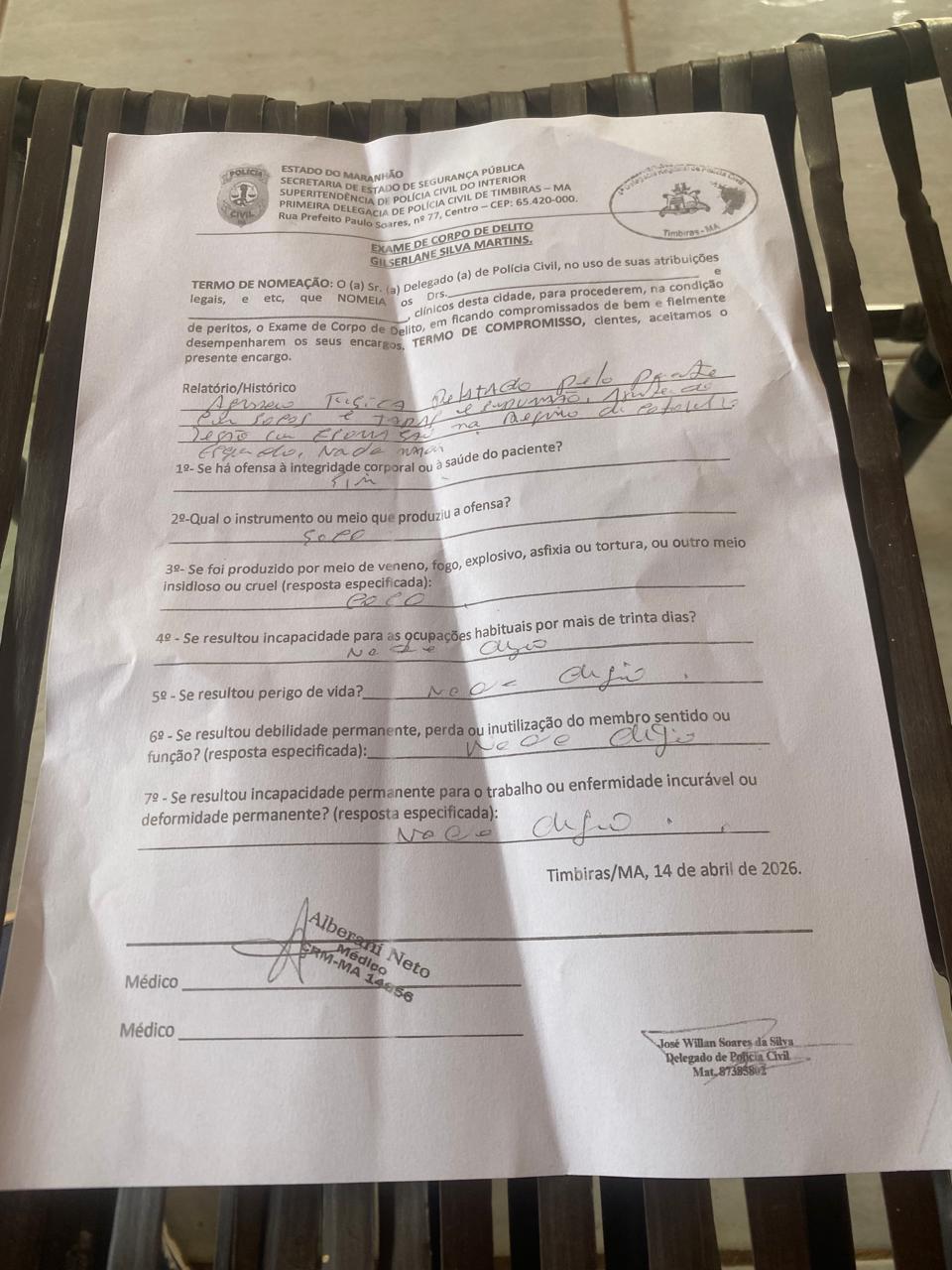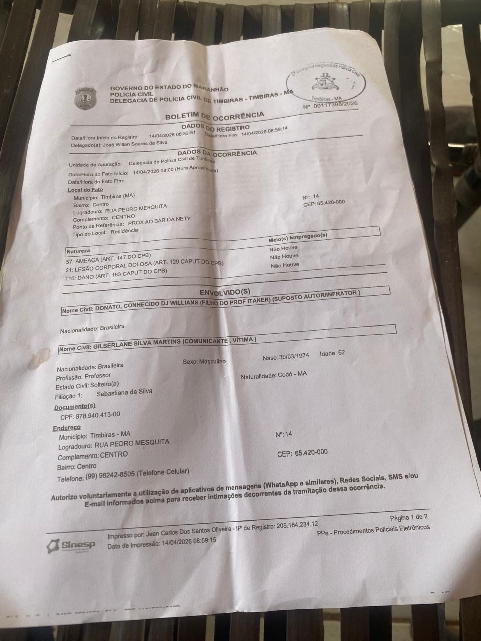 Na manhã desta terça-feira, 14 de abril de 2026, o professor e blogueiro Gil, responsável pelo site Blogdoprofessorgil.com.br, registrou um boletim de ocorrência após ser vítima de agressão física e verbal em Timbiras, Maranhão. O acusado é o indivíduo conhecido como Donato, popularmente chamado de “DJ William”.