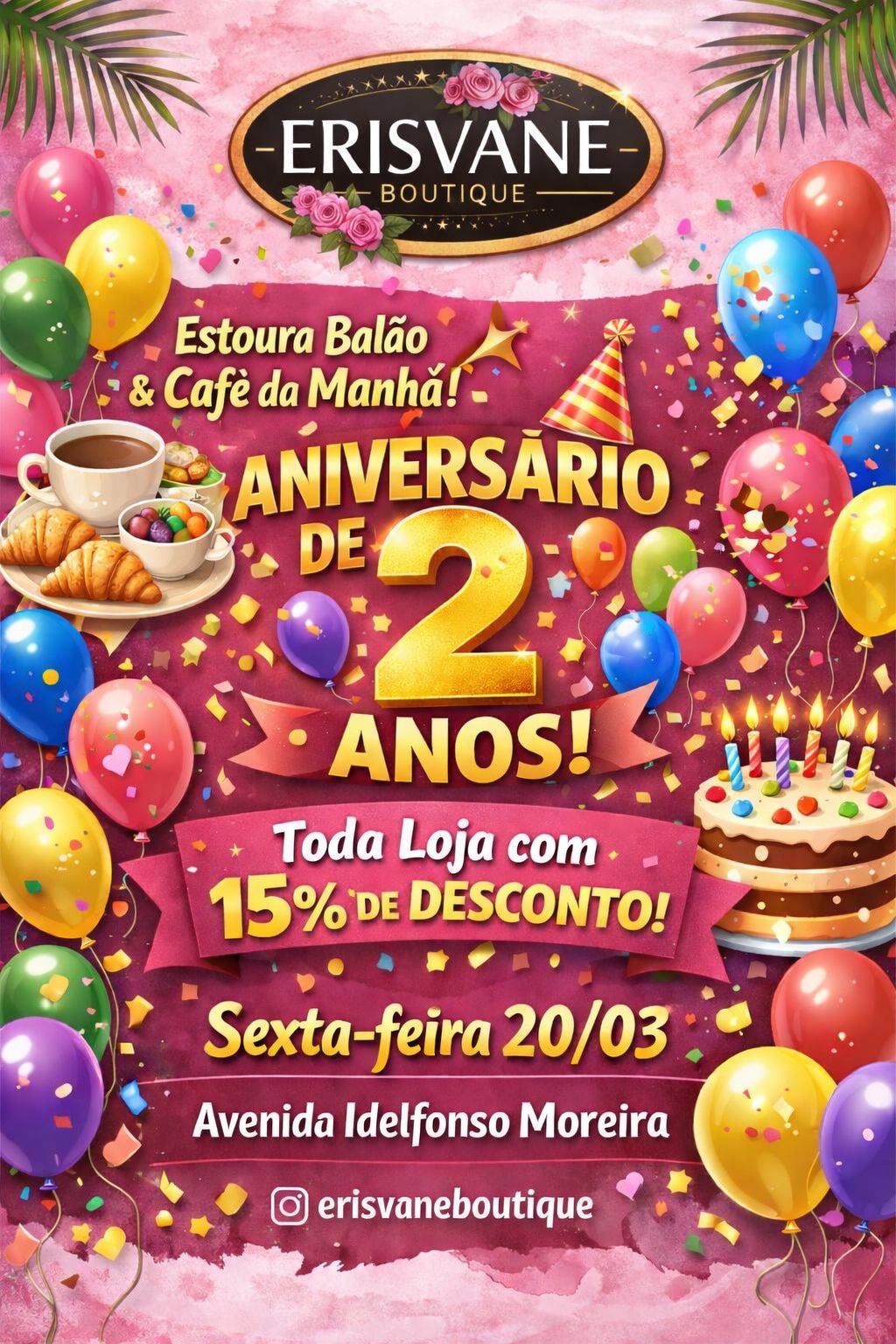 A Erisvane Boutique, localizada na Avenida Idelfonso Moreira, no Centro de Timbiras-MA, comemora nesta sexta-feira, dia 20, seu aniversário de dois anos de funcionamento. Para marcar a data, a loja preparou uma ação promocional: todos os produtos estarão com 15% de desconto.