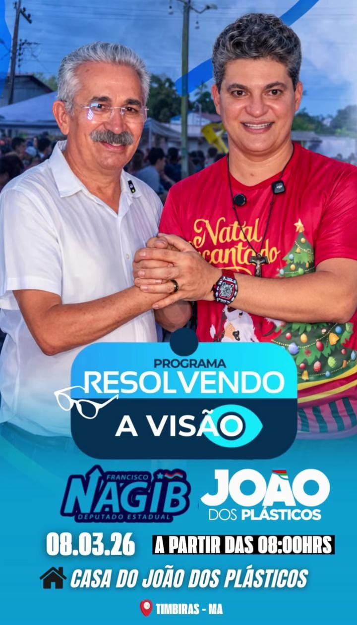 No próximo domingo, dia 8 de março, será realizado o programa Resolvendo a Visão na residência do amigo João dos Plásticos, no bairro Olaria, em Timbiras. A iniciativa tem como objetivo disponibilizar consultas oftalmológicas gratuitas à comunidade, ampliando o acesso à saúde ocular.