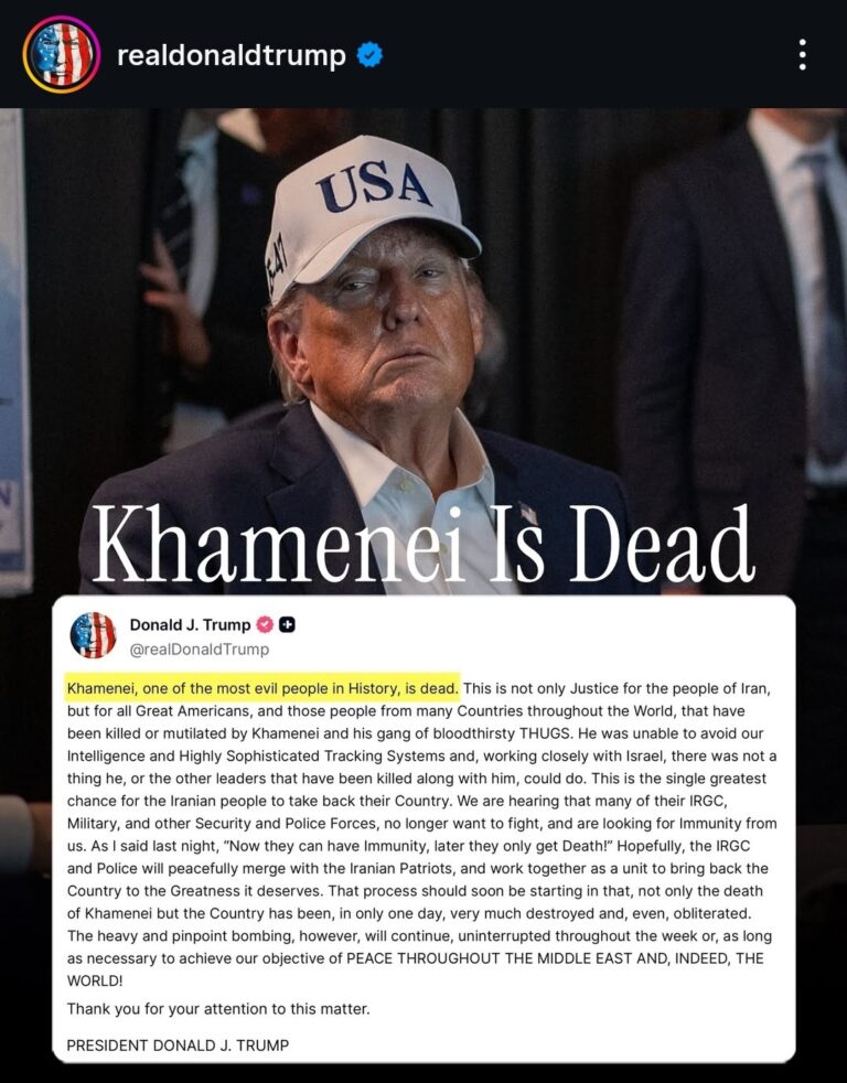 Através de suas redes sociais e em declarações posteriores à imprensa, o presidente americano afirmou que a morte do líder iraniano representa “a maior oportunidade para o povo iraniano retomar seu país”.