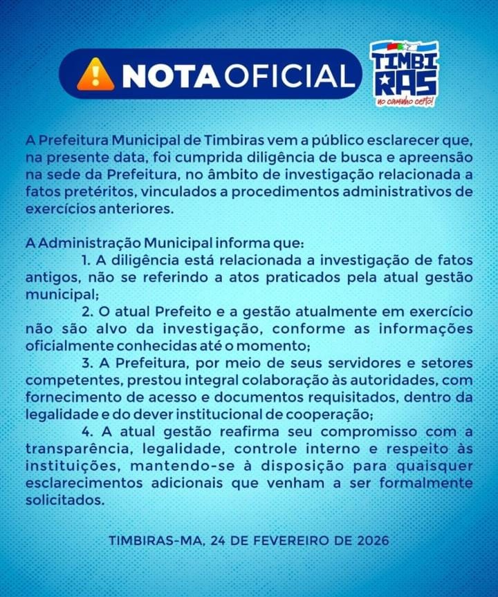 O vereador Junão, parlamentar da Câmara Municipal de Timbiras, divulgou nesta terça-feira, 24, uma nota pública dirigida à população timbirense em resposta à operação da Polícia Federal realizada na sede da prefeitura. A ação investigativa apura possíveis irregularidades na administração municipal.