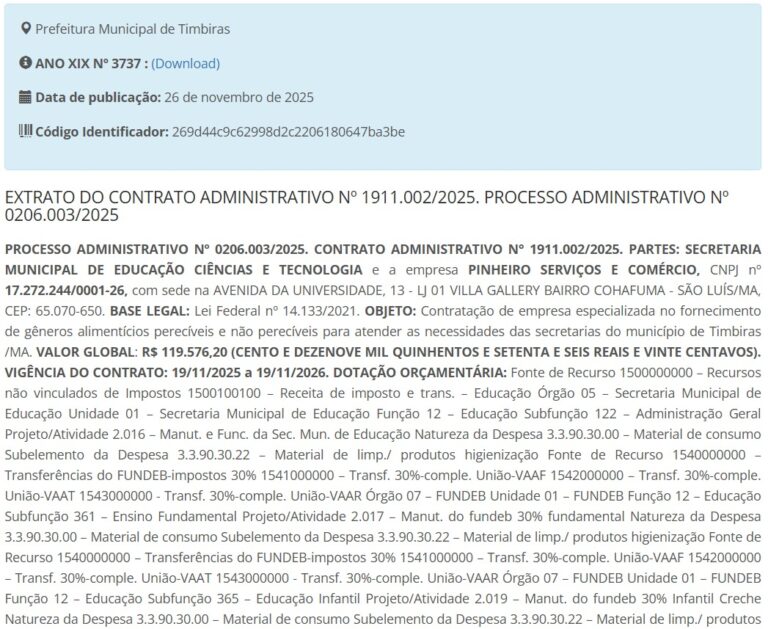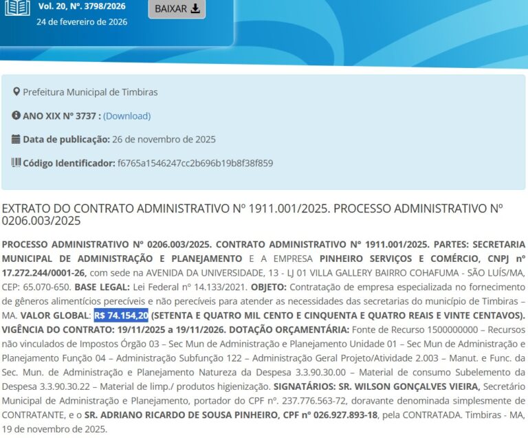 O jornalista Marco Silva descobriu que a empresa PINHEIRO SERVIÇOS E COMÉRCIO, registrada no nome empresarial Adriano Ricardo de Sousa Pinheiro, continua fechando contratos robustos com a Prefeitura de Timbiras — mesmo após entrar no radar da Polícia Federal.