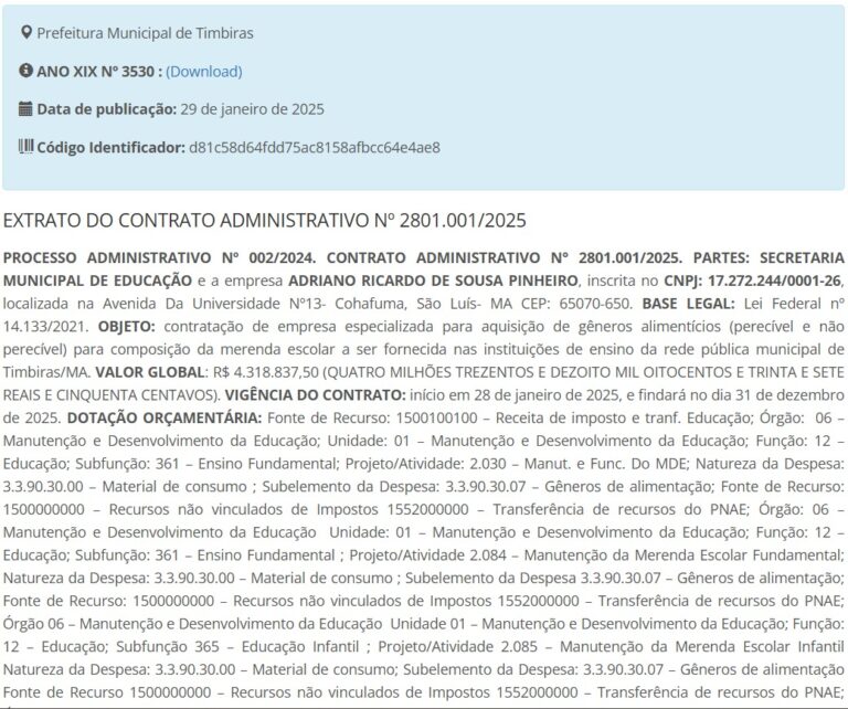 Com o fim do mandato de Borba, quem assumiu a prefeitura foi o sobrinho dele, o prefeito Paulo Vinícius. E logo no início da nova gestão, em 29 de janeiro de 2025, a mesma empresa investigada foi contratada para fornecer gêneros alimentícios (perecíveis e não perecíveis) destinados à merenda escolar da rede municipal. Valor do contrato: R$ 4.318.837,50.