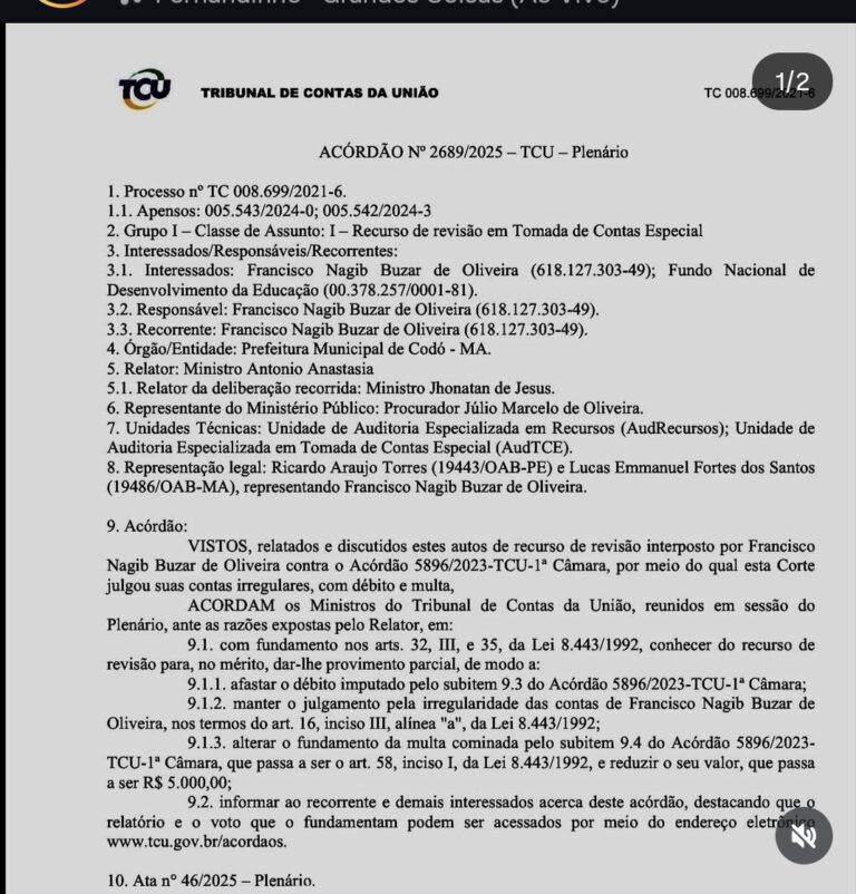 A decisão, que consta do Acórdão nº 2689/2025, julgado pelo Plenário da Corte, no âmbito do processo que envolve a Prefeitura de Codó (MA), confirma a elegibilidade do emedebista, o que garante condições de participar normalmente das eleições deste ano.