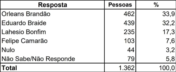 A pesquisa mostrou equilíbrio e apresentou um empate técnico entre dois pré-candidatos: o prefeito de São Luís, Eduardo Braide (PSD), e o secretário de Assuntos Municipalistas do Maranhão, Orleans Brandão (MDB).