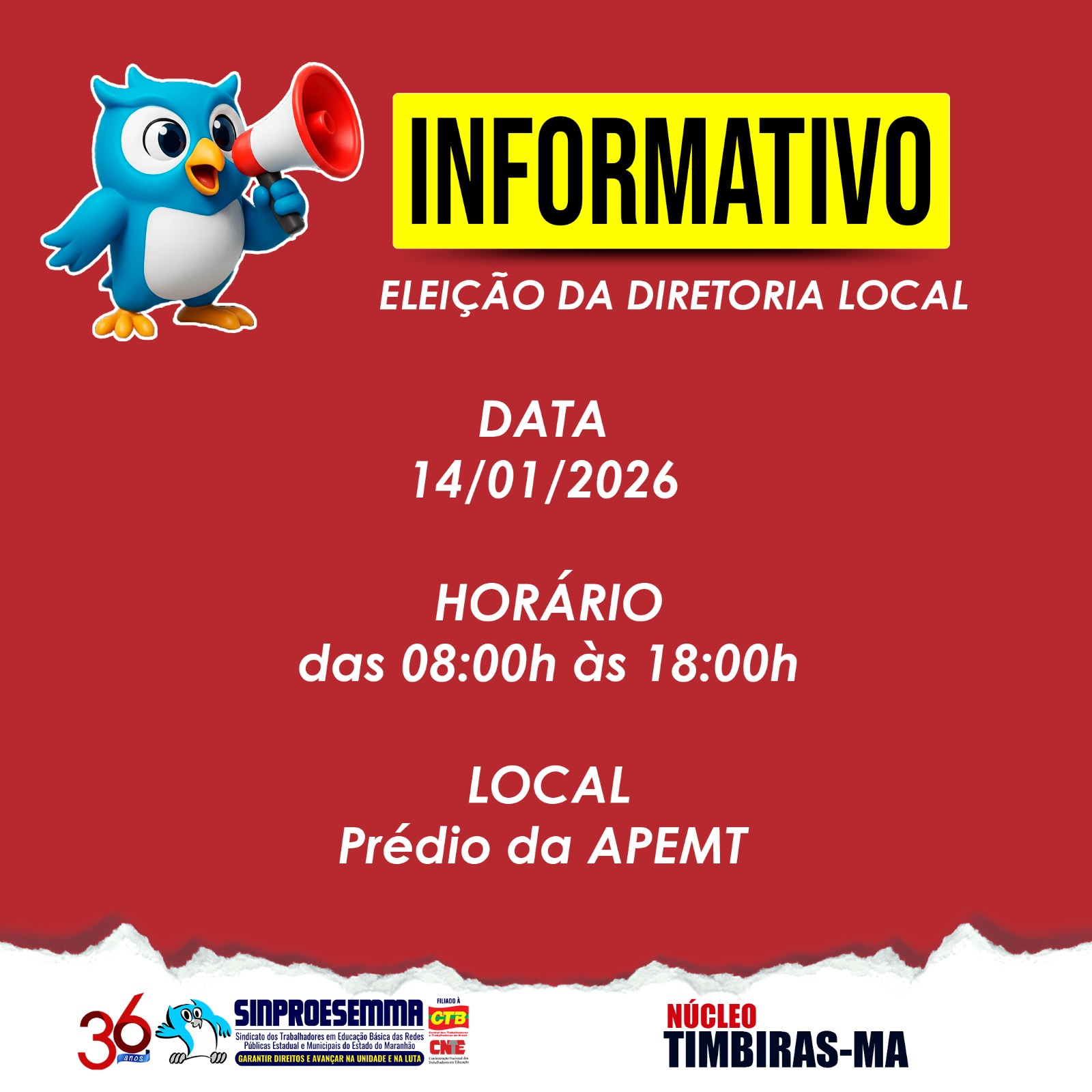 Na próxima quarta-feira, 14 de janeiro, será realizada a eleição para a nova diretoria do Sindicato dos Professores de Timbiras. O pleito mobiliza docentes da rede pública, que terão a oportunidade de votar para seus representantes para o próximo mandato.