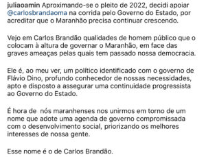 Após posar ao lado de Carlos Brandao (PSDB), já empenhando seu apoio a pré-candidatura ao Governo do Maranhão do vice-governador, na última sexta-feira (13). O ex-presidente do PDT no Maranhão, Julião Amim, declarou que encontra em Brandão todas as características para governar o Maranhão.