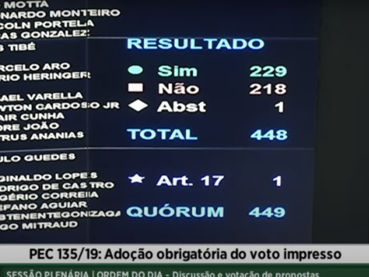 Para ser aprovada, a PEC precisava de, no mínimo, 308 votos. No entanto, o texto elaborado pela deputada Bia Kicis (PSL-DF) teve o apoio de apenas 229 deputados. Outros 218 deputados votaram contra a PEC e um parlamentar se absteve. Ao todo, 448 votos foram computados.