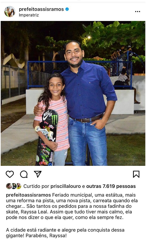 “Feriado municipal, uma estátua, mais uma reforma na pista, uma nova pista, carreata quando ela chegar… São tantos os pedidos para a nossa fadinha do skate, Rayssa Leal. Assim que tudo tiver mais calmo, ela pode nos dizer o que ela quer, como ela sempre fez. A cidade está radiante e alegre pela conquista dessa gigante! Parabéns, Rayssa!”, escreveu o prefeito ao postar uma foto ao lado da skatista.