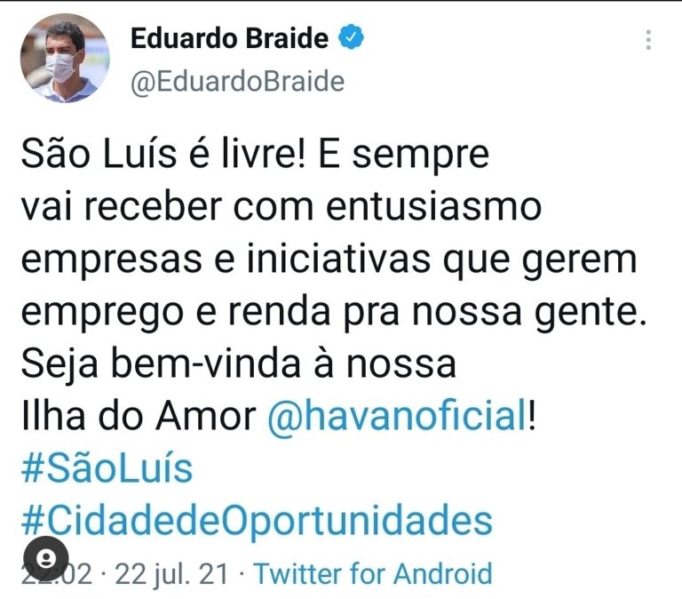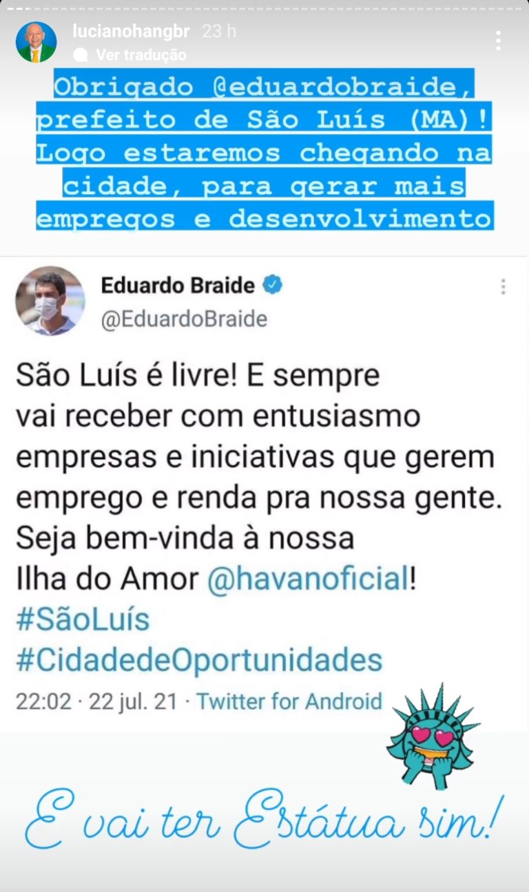 “São Luís é livre! E sempre vai receber com entusiasmo empresas e iniciativas que gerem emprego e renda pra nossa gente. Seja bem-vinda à nossa Ilha do Amor, Havan”, declarou.