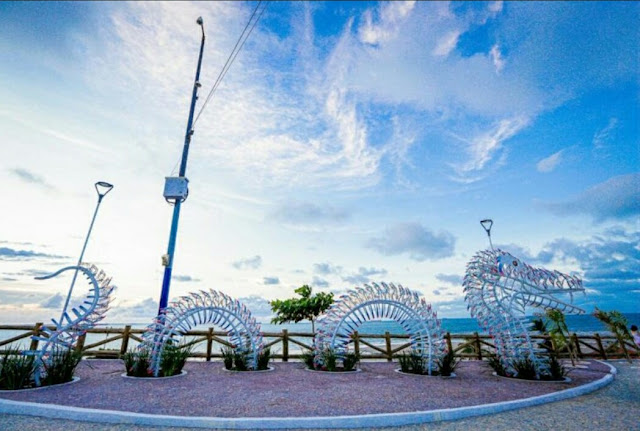 “A pintura nos degraus ao longo do passeio tem tons alaranjados à amarelados, canteiros revestidos com tijolinhos mais rústicos e com variação de tonalidades azuis esverdeadas, que remetem a mobilidade das ondas do mar, a escolha por pedra portuguesa no patamar superior de toda estrutura faz uma releitura do nosso centro histórico, com um traçado mais modernista. E por fim, no coração do projeto, uma escultura instagramável com argolas que saem do piso dando a impressão de fúria e imponência tal qual conta a famosa lenda; esta recebe iluminação interna de efeito e acabamentos em pintura náutica, por conta da salinização” pontuou a arquiteta Brenda Costa. (Fonte: Setur-MA)