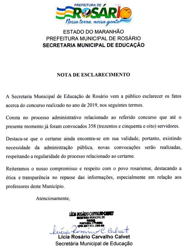 Visando sempre a transparência e o compromisso com o cidadão, a Prefeitura Municipal de Rosário, emitiu na manhã desta sexta-feira (16), nota de esclarecimento falando acerca do concurso público realizado em 2019 para a educação.