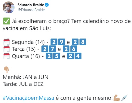 Braide ainda anunciou a liberação para o cadastro na plataforma de vacinação para toda a população adulta da capital, já que a partir de hoje todos os ludovicences a partir de 18 anos podem se cadastrar, pois essa faixa etária deve se vacinar na semana que vem.